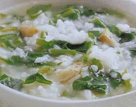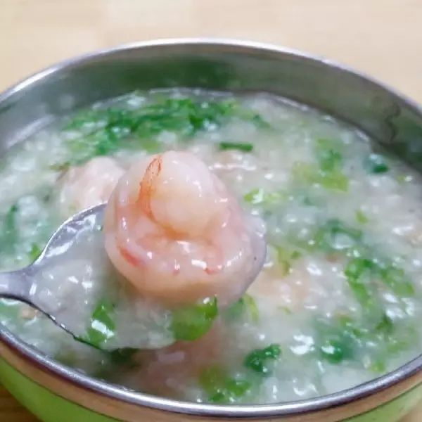 3、小白菜、姜絲先下入粥鍋中,煮沸后再下蝦仁,待蝦仁煮熟,加鹽調(diào)味即成。